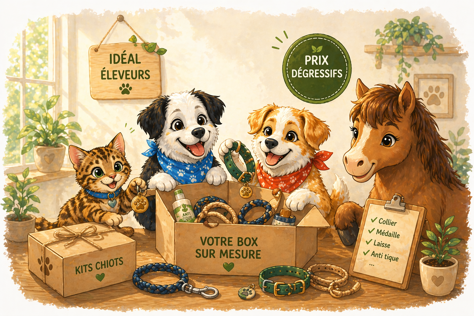 Que vous soyez éleveur, professionnel ou simplement en quête d’un ensemble harmonieux, composez votre box selon vos envies : collier, médaille, laisse, antiparasitaire… à vous de créer l’association parfaite.