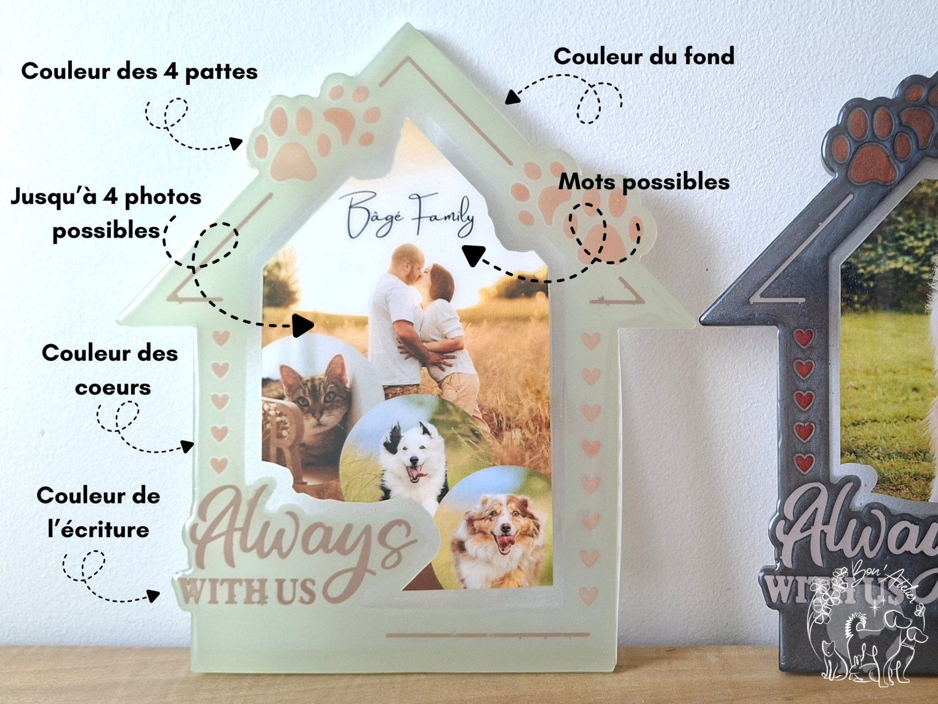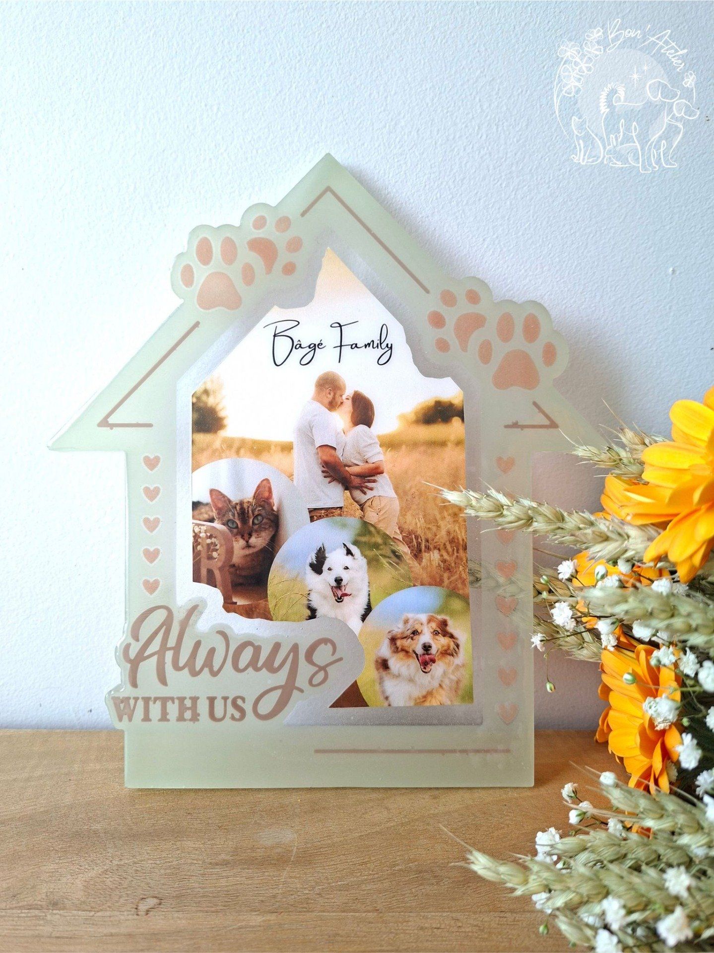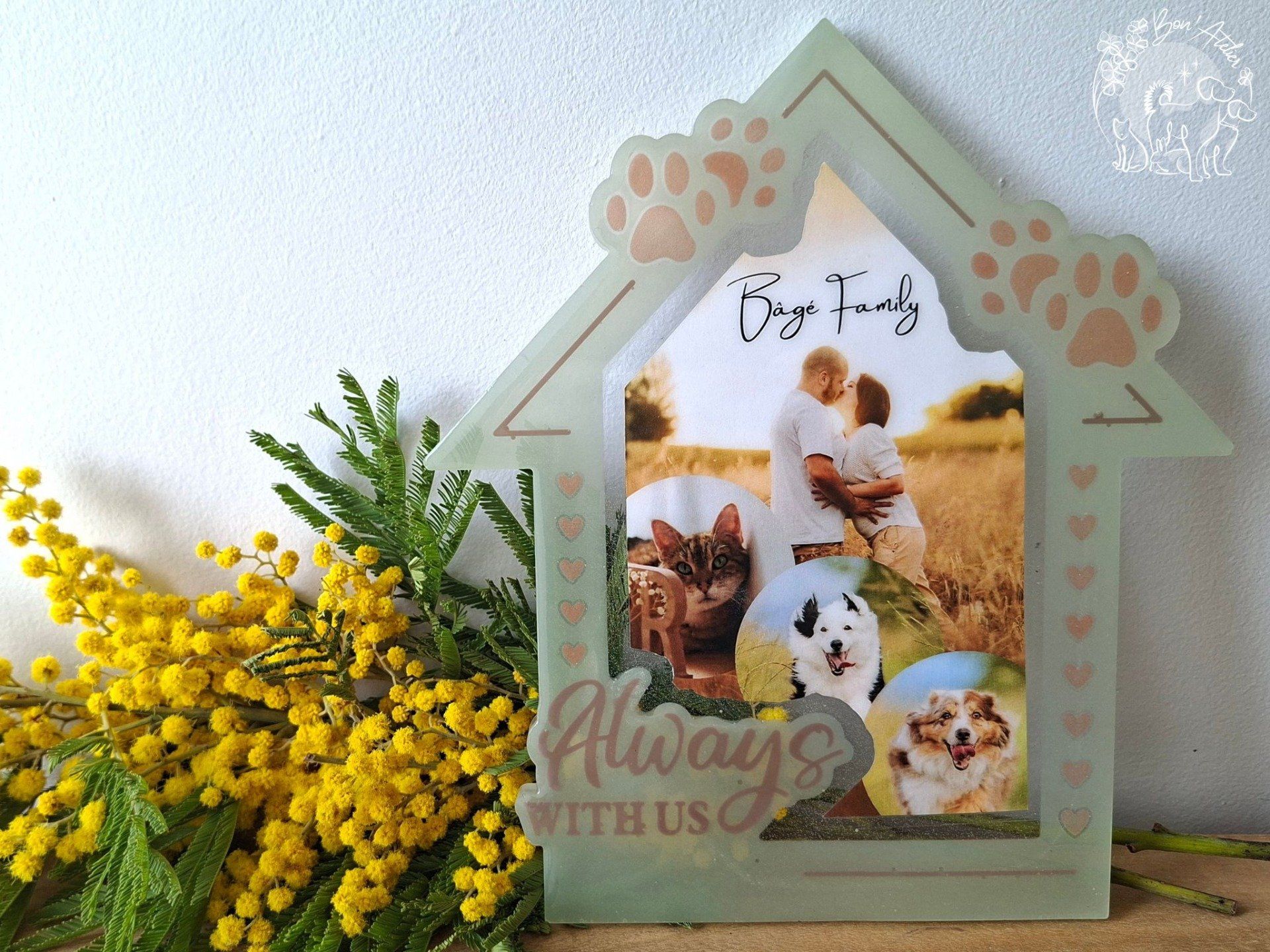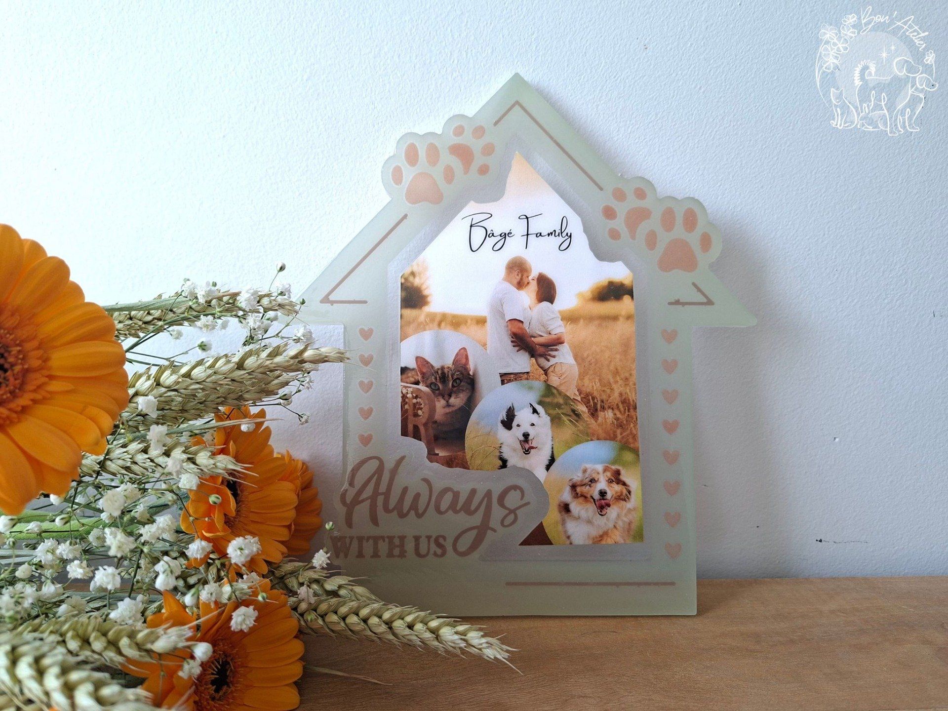Avec Foyer, je crée pour vous un cadre personnalisé en forme de maison, symbole de leur présence au cœur de votre famille.