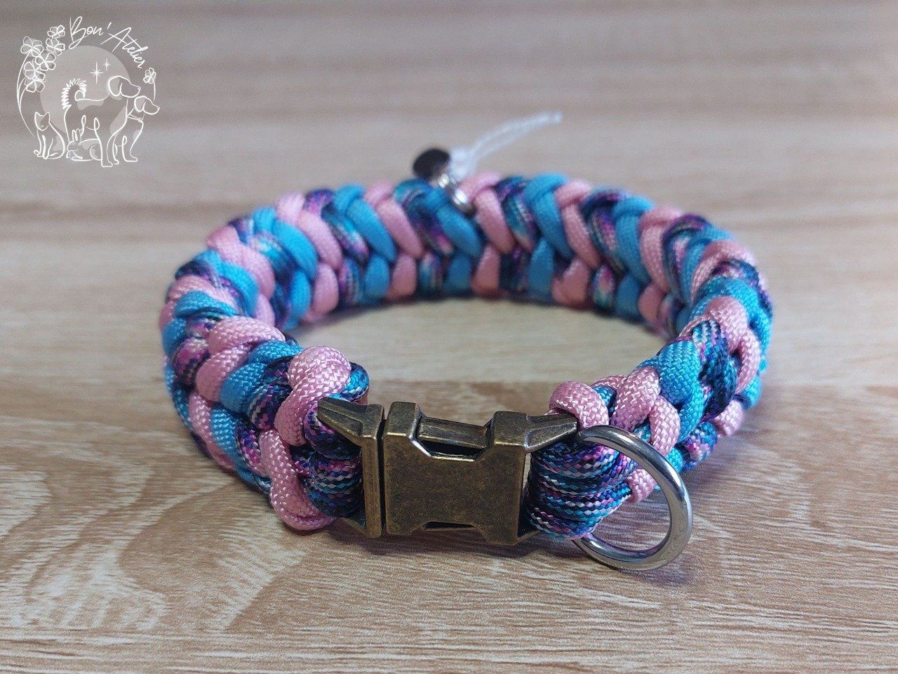 Matériaux : Paracord type III avec une très forte résistance à la rupture, clip en laiton avec une résistance à la rupture de 120kg, anneau en acier inoxydable pour accrocher la laisse avec une résistance à la rupture de 200kg. Un petit anneau vient compléter le tout afin d'accrocher la médaille de votre compagnon.