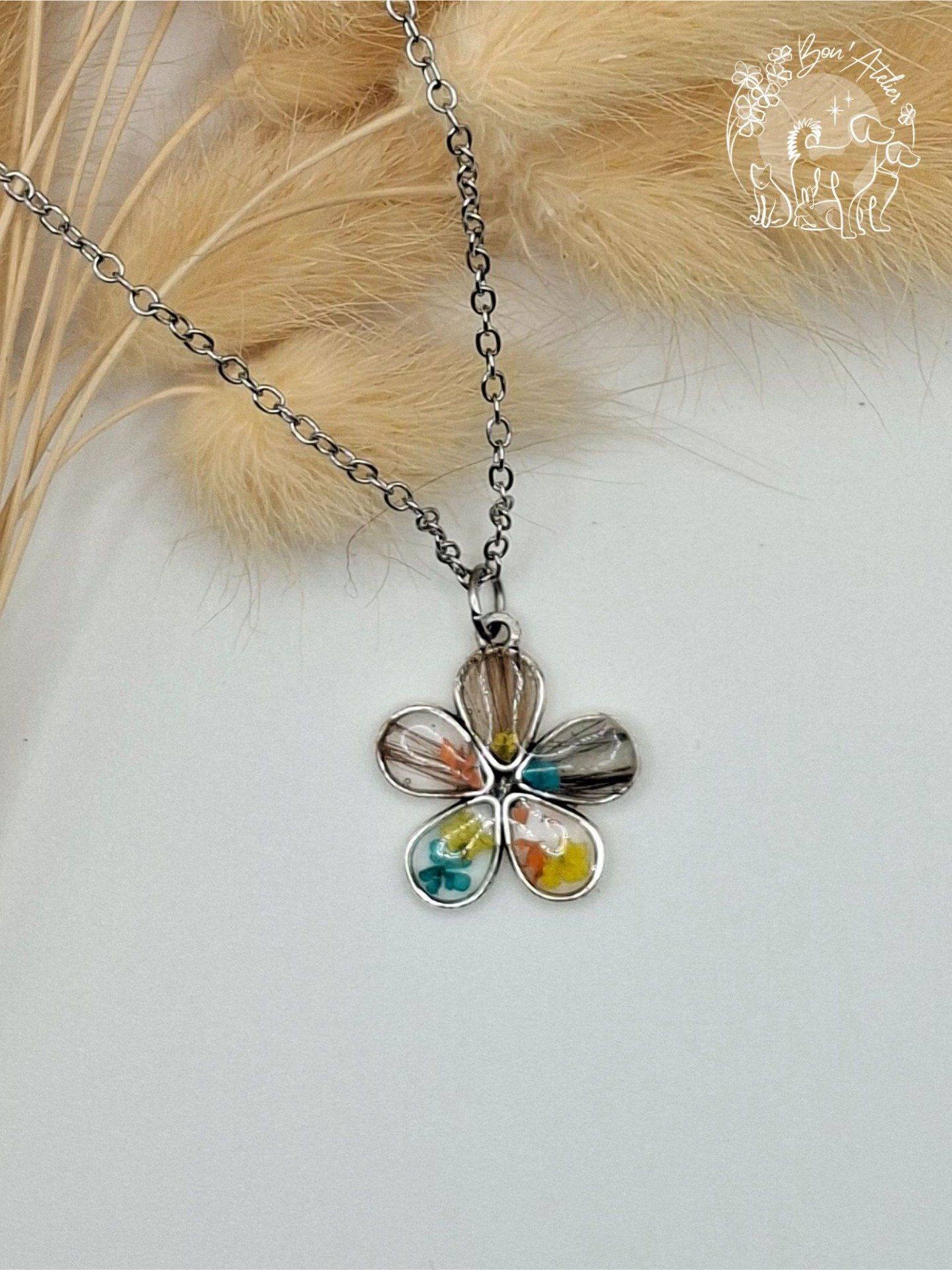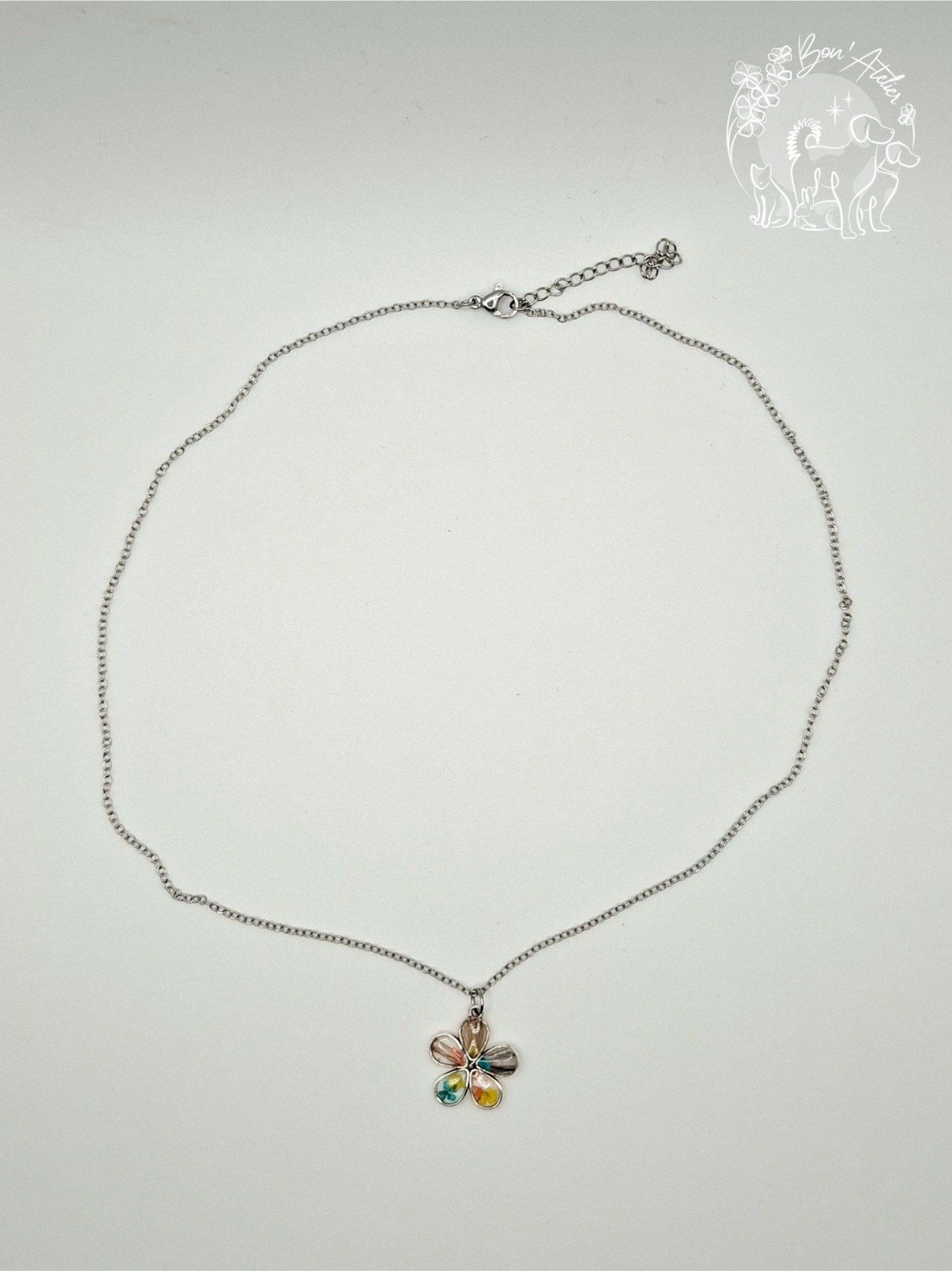 De petites pétales de fleurs sont ajoutés à chaque pétale du collier : merci de m'indiquer, pétale par pétale, la couleur souhaitée (à choisir ici)