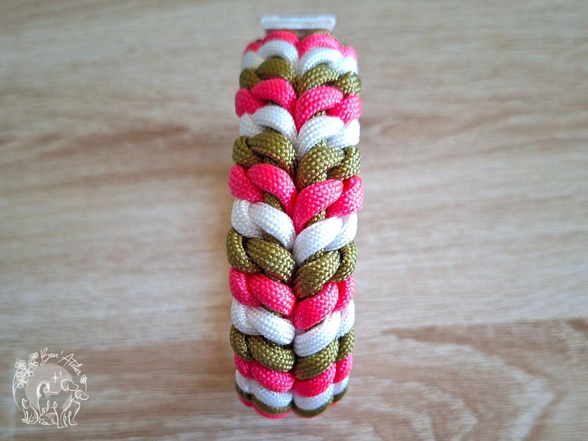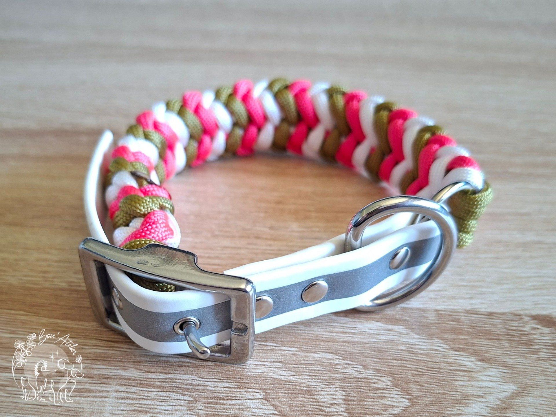 - Coloris : "Rose Néon, Or, Blanc" pour la Paracord, "Blanc" avec bande réfléchissante pour la Biothane (coloris exclusifs !)