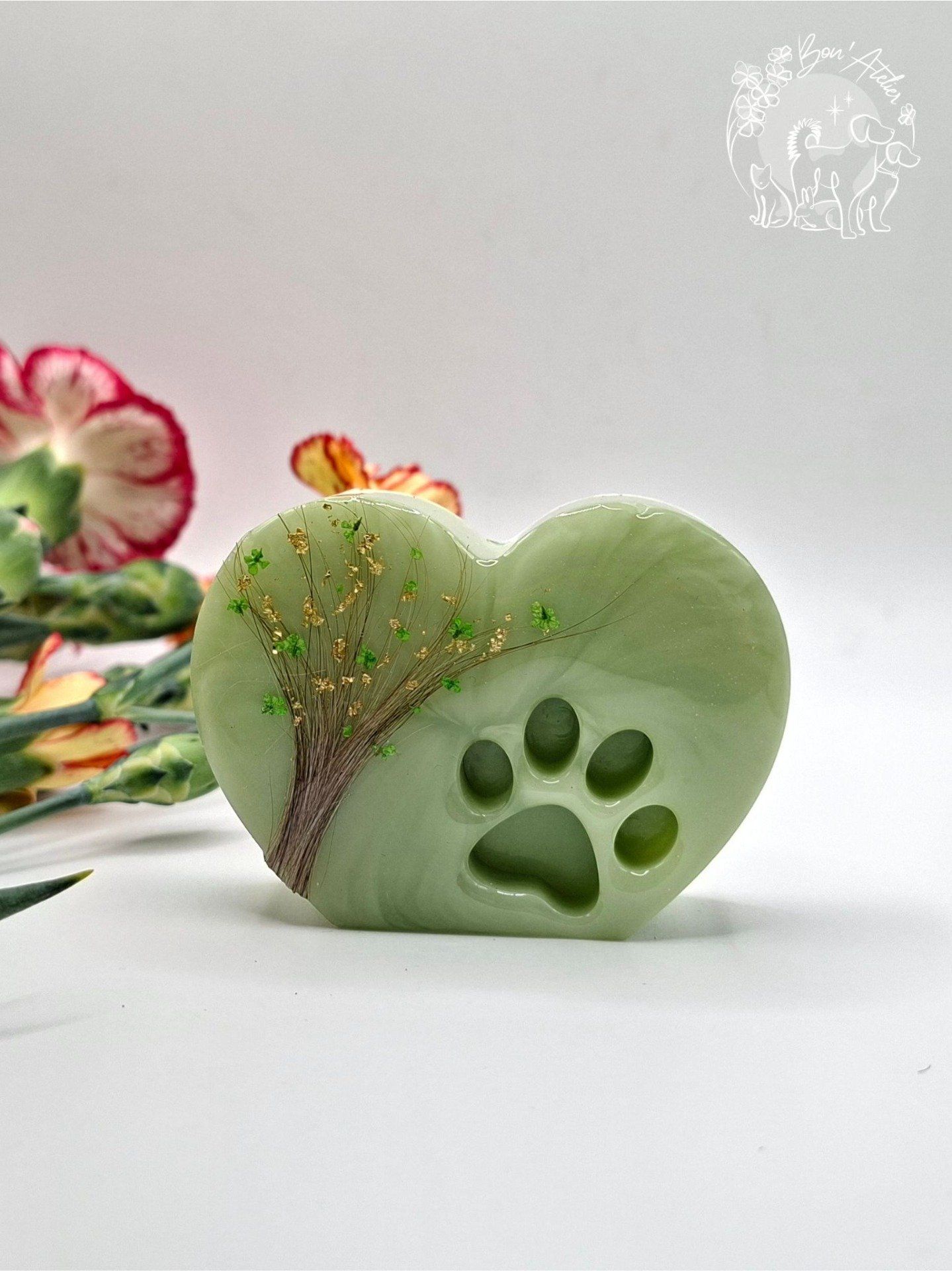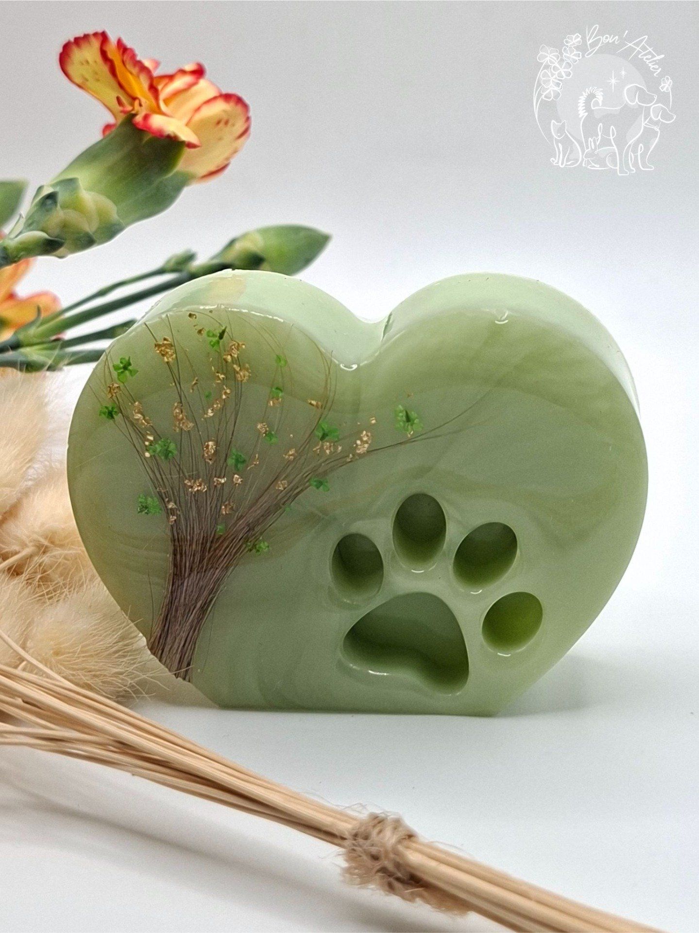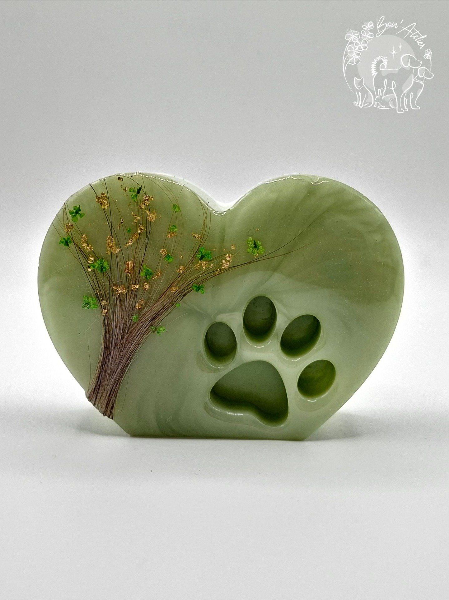 En son coeur, un arbre de vie façonné à partir des poils de votre animal, symbole d'attachement, de continuité et d'Amour enraciné. La forme de coeur évoque l'amour inconditionnel, tandis que l'empreinte de patte rappelle la présence fidèle qui a marqué votre vie.