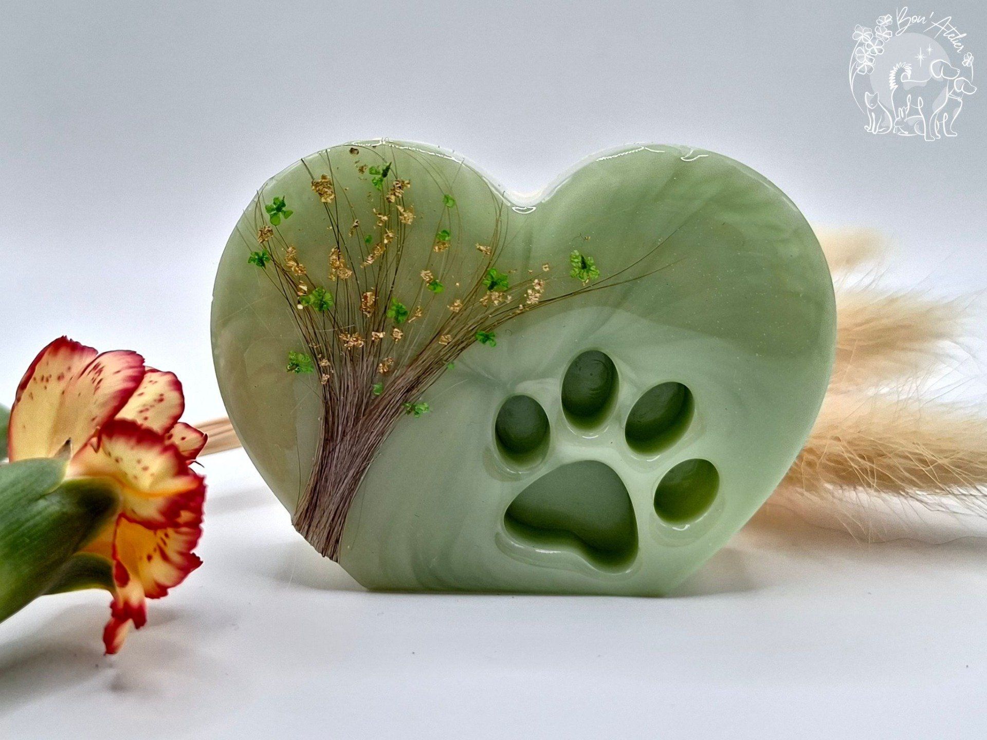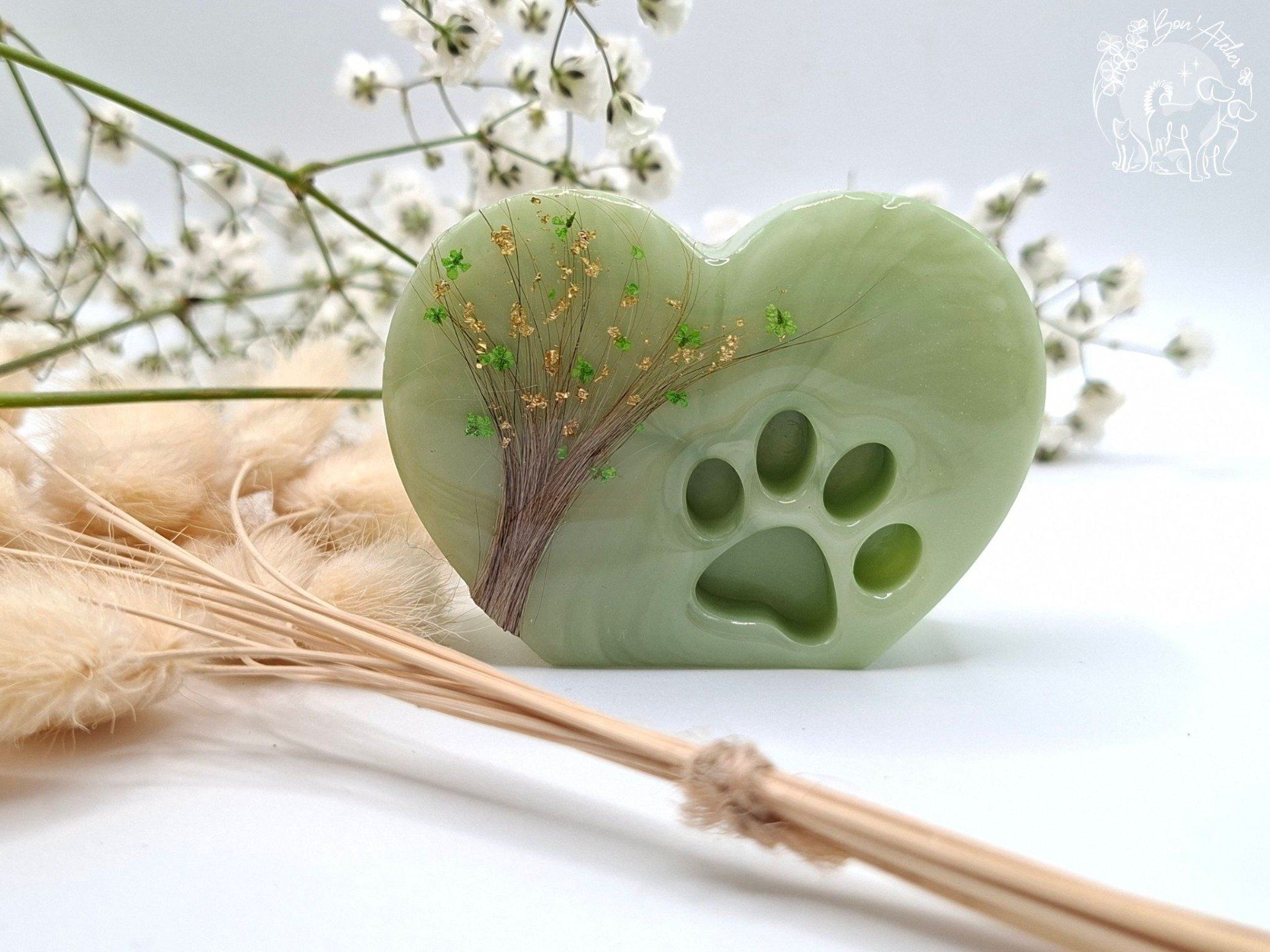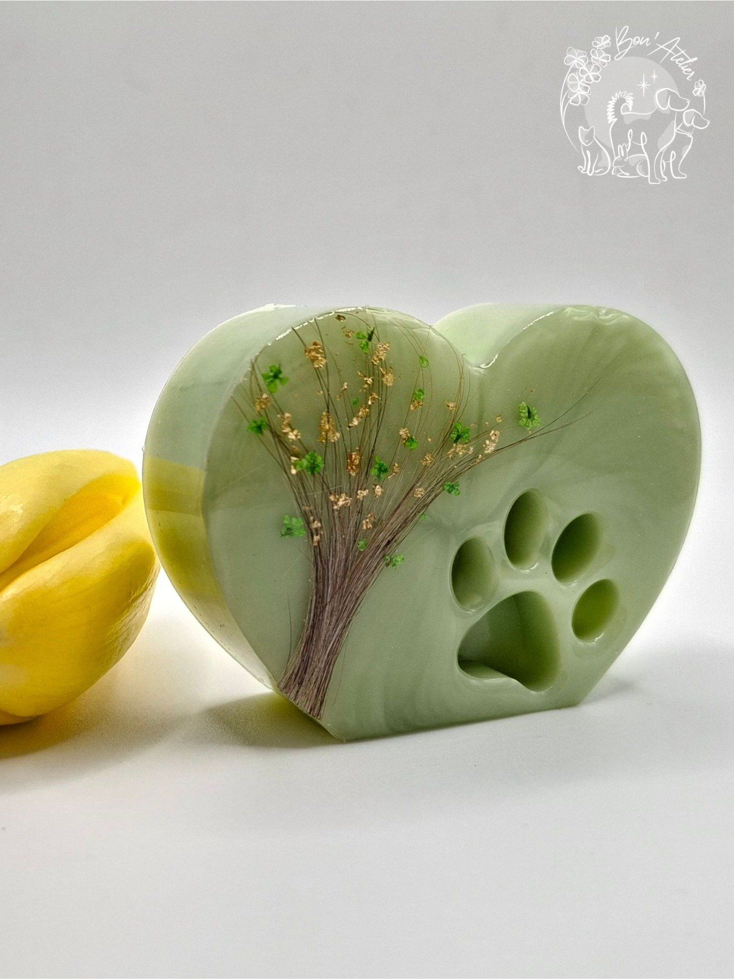 En son coeur, un arbre de vie façonné à partir des poils de votre animal, symbole d'attachement, de continuité et d'Amour enraciné. La forme de coeur évoque l'amour inconditionnel, tandis que l'empreinte de patte rappelle la présence fidèle qui a marqué votre vie.