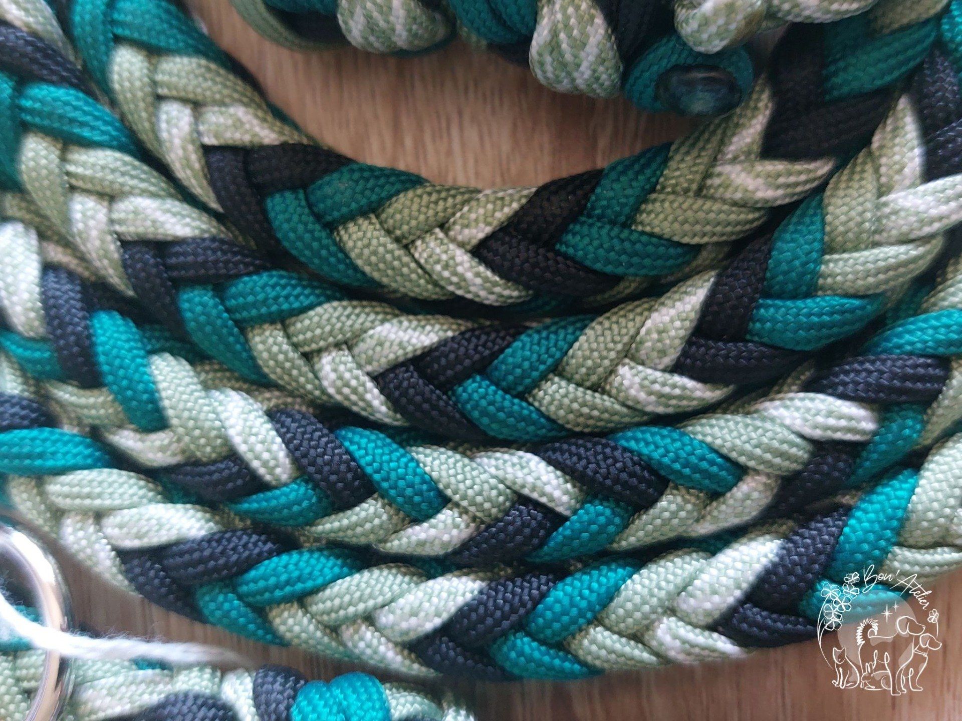 Notre laisse 3 points ou multiposition est faite en Paracord type III, tressée, de notre collection "Romy".